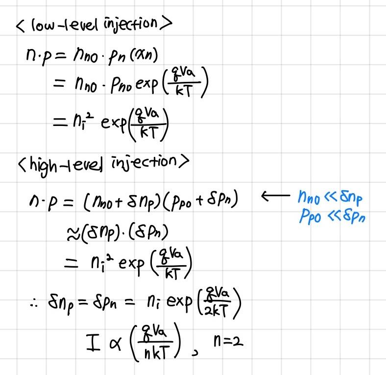 위의 식에서처럼 high-level injection을 가정하면 nn0 ≪ δnp, pp0 ≪ δpn 이 되어 carrier의 농도를 표현하는 식에 변화가 생기게 됩니다. 기존의 low-level injection 상태를 가정했을 때는 I (or J)가 qVa/kT에 비례했지만, high-level injection에서는 qVa/2kT에 비례하게 됩니다. 즉, 전압 증가에 대한 전류 증가 폭이 감소하는 것을 알 수 있습니다.