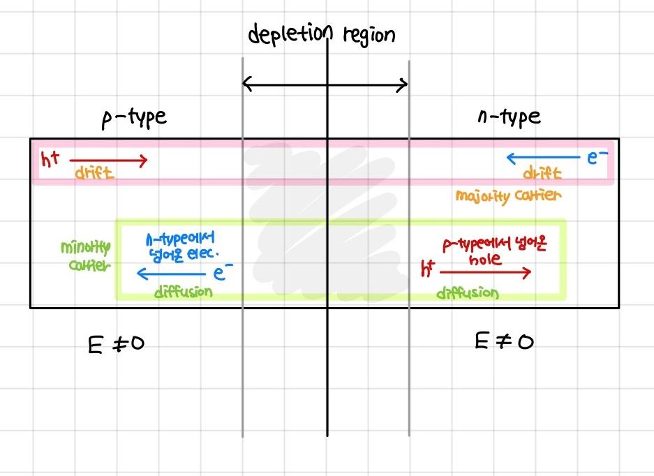 이는 바로 majority carrier의 drift current 입니다. Majority carrier는 junction에서 먼쪽으로부터 p 영역에서는 정공을, n 영역에서는 전자를 junction 쪽으로 이동시키는 drift current를 발생시킵니다. 이는 minority carrier와의 recombination, 혹은 depletion region으로 injection된 carrier들로 인해 감소한 carrier들을 공급하는 역할을 한다고 이해할 수 있습니다.