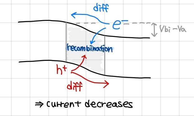 그림처럼 forward bias 하에서 carrier들이 diffusion되어 반대 영역으로 이동할때, depletion region에서 두 carrier가 서로 만나 recombination이 발생합니다. 이렇게 되면 diffusion current를 발생시키는 carrier의 수가 감소하기 때문에 current도 감소하게 됩니다. 이때, recombination에 의한 영향은 Va가 작을 때 더 큰 경향을 보입니다. 이는 Va가 작을 때는 diffusion 되는 carrier 중 recombination 되는 carrier의 비중이 더 큰 반면, Va가 커질수록 그 비중은 줄어들기 때문입니다.