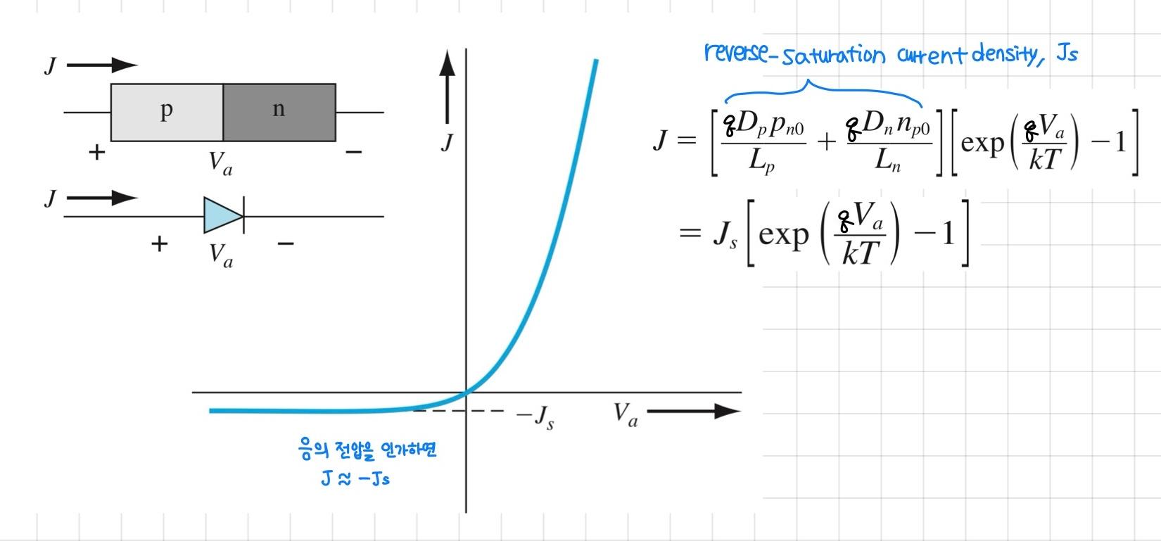 또한 음의 Va가 인가될 때 -Js에 해당하는 약한 음의 포화 전류만이 흐르는 것을 알 수 있는데요, 이는 오른쪽 식에서 보면 exp 항 앞의 상수와 같은 값으로, reverse-saturation current density로 정의됩니다.