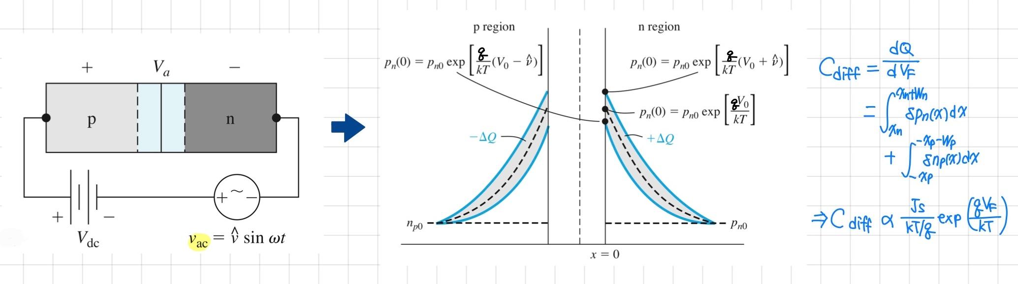 pn junction 마지막 부분에서도 depletion region에 의한 capacitance를 정의했었는데요, forward bias가 인가될 때에도 diffusion capacitance를 정의할 수 있습니다. pn diode에 forward bias가 인가될 때 이 전압이 AC로 인가된다면 diffusion되는 minority carrier 수도 변화하게 됩니다. 즉, diffusion에 대한 cap 성분을 정의할 수 있게 되는데요.