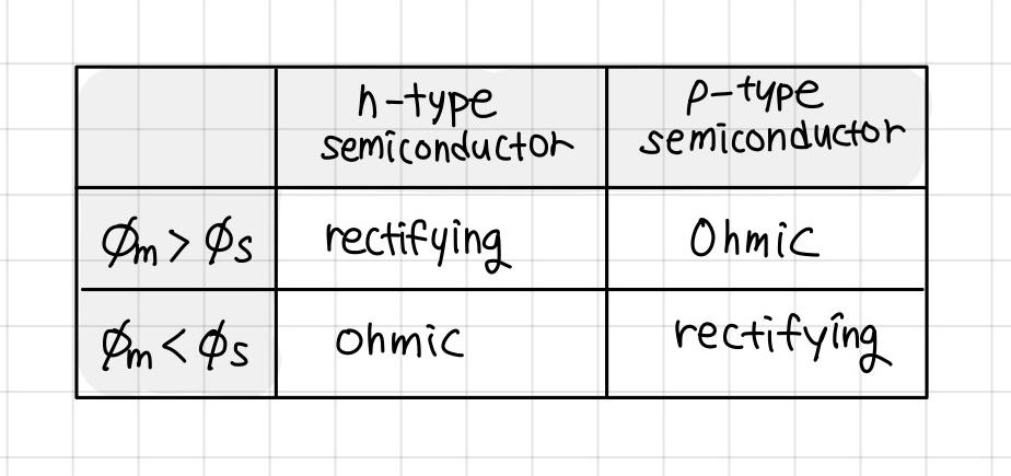 다음은 n-type 혹은 p-type semiconductor와 metal이 접합할 때, workfunction 사이의 관계를 통해 각 junction이 어떤 역할을 할 수 있는지 나타내는 표입니다.