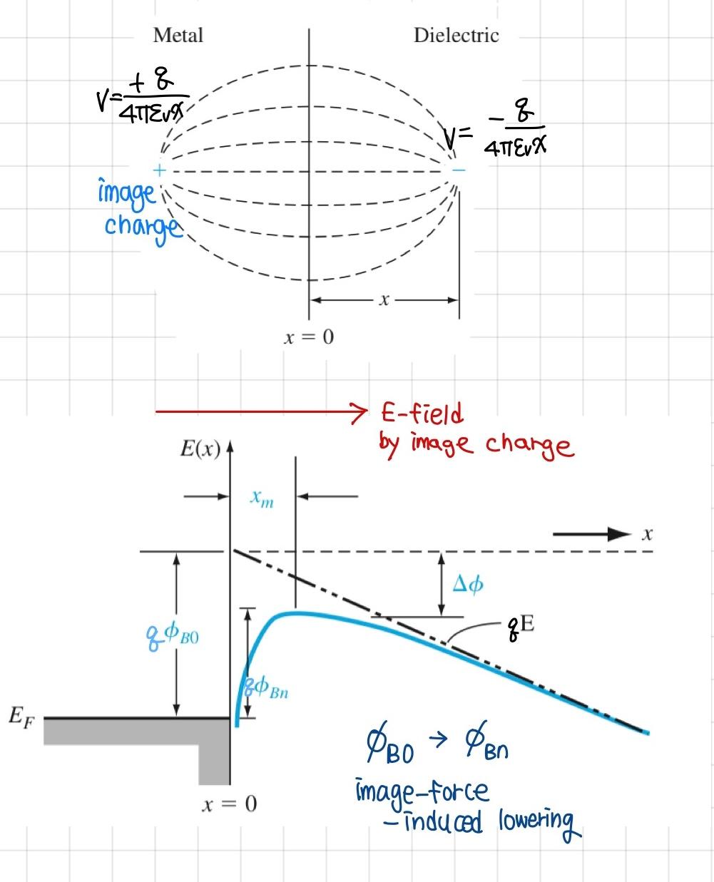 이를 MS junction에서 적용해보자면, semiconductor의 전자로 인해 금속에서는 (+) charge의 image charge가 존재하는 것과 같은 영향을 갖게 되고, 이로 인해 metal에서 semiconductor 방향으로의 E.field가 형성됩니다. 이렇게 형성된 E.field에 의해 semiconductor의 전자를 metal쪽으로 끌어당기는 힘이 발생하게 되고, 이로 인해 Schottky barrier의 높이가 감소하게 됩니다.