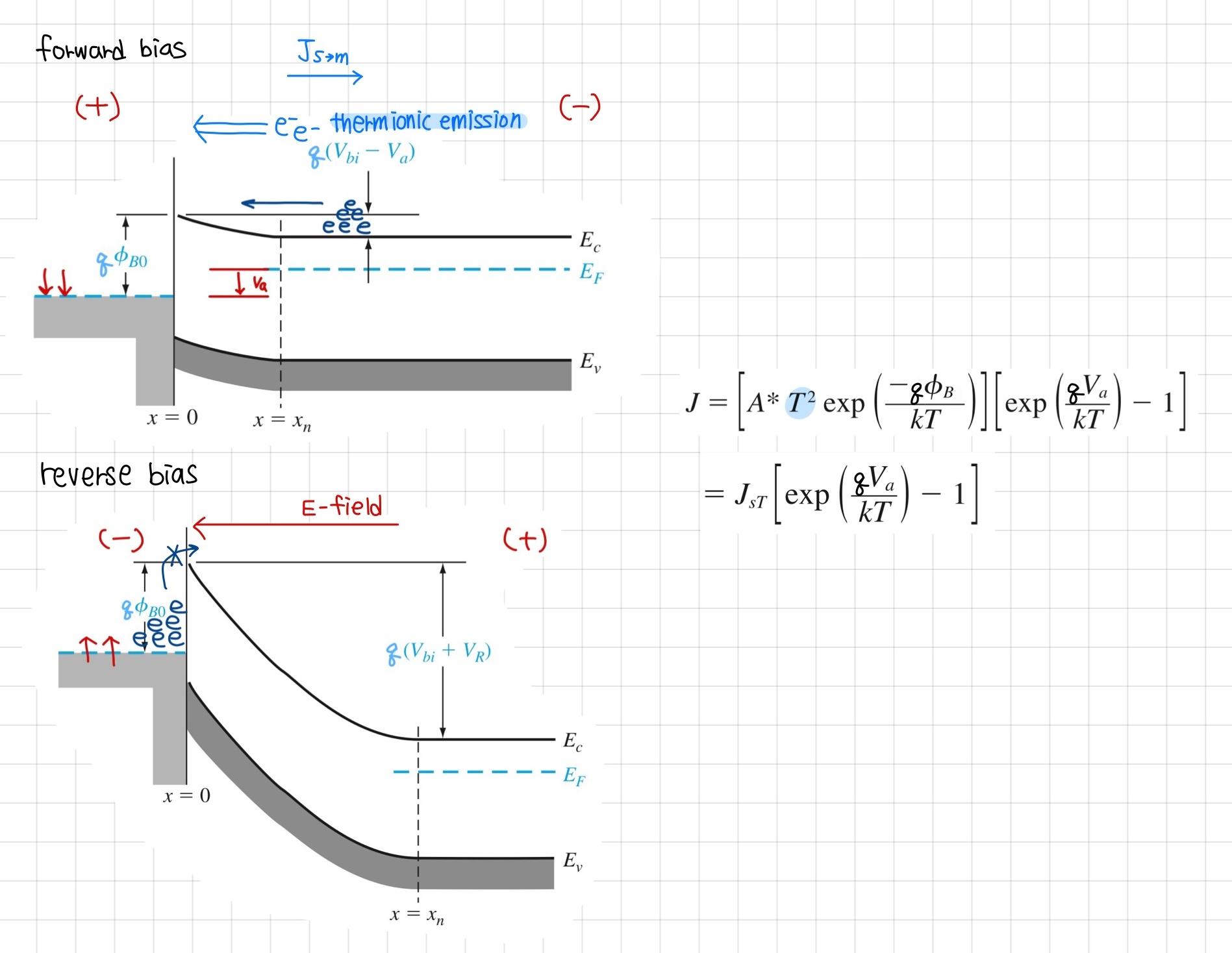 반대로 reverse bias가 인가되면, 전위 장벽의 높이는 커지게 됩니다. 또한 bias에 의해 semiconductor 쪽에서 metal 방향으로 E.field가 발생하게 되는데요, 이에 따라 전자가 metal에서 semiconductor로 이동하려고 하지만 Schottky barrier에 의해 그 흐름이 막히게 됩니다. 따라서 reverse bias 하에서는 전류가 -JsT (reverse saturation current density)에 해당하는 값으로 한정됩니다.