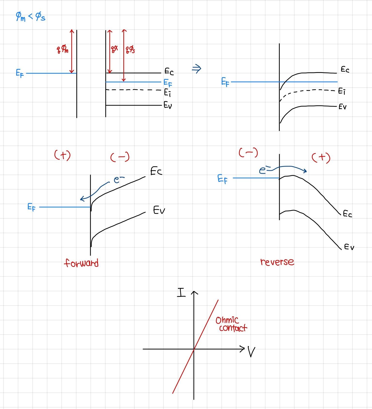 이 조건에서는 n-type semiconductor의 EF가 metal의 EF보다 낮은 곳에 위치해 있었기 때문에 오른쪽과 같은 energy band 형태가 됩니다. 여기에 bias를 가해주게 된다면 forward, reverse bias 모두에서도 electron이 잘 이동하는 것을 확인할 수 있습니다. 따라서 I-V 특성을 확인해본다면 어떤 bias에서도 전류가 잘 흐르는 ohmic contact 특성을 갖는 것을 알 수 있습니다.